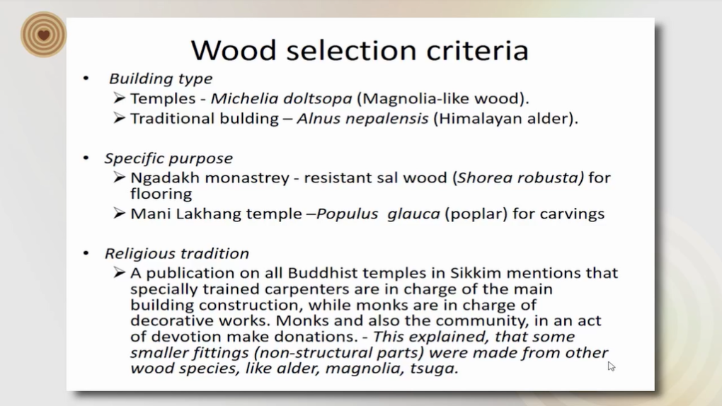 Six temple structures from several regions and altitudes have been investigated. Samples were collected from important structural elements, and identified by means of a microscope. By knowing the wood species the criteria of wood selection could be understood. Besides the environmental factor, religious and social factors also played a role. This study will show, the relationship of the local people with the forest environment in the present and in the past.