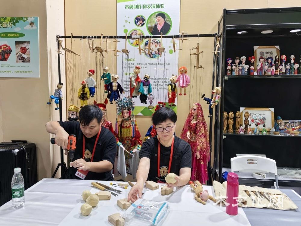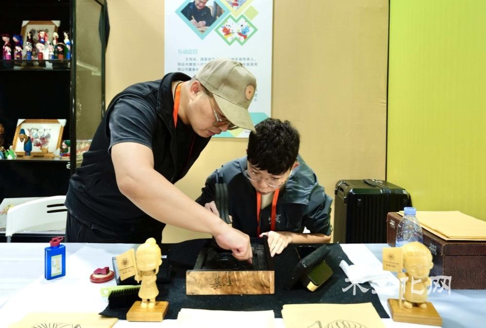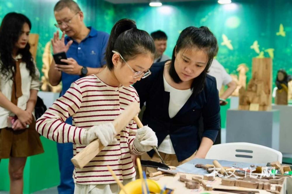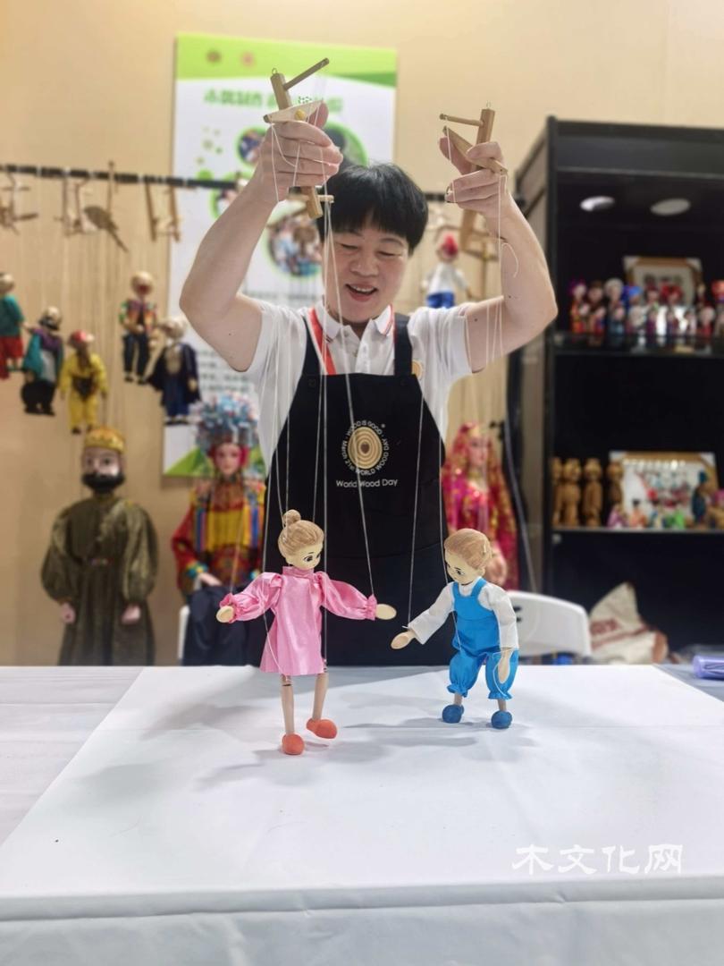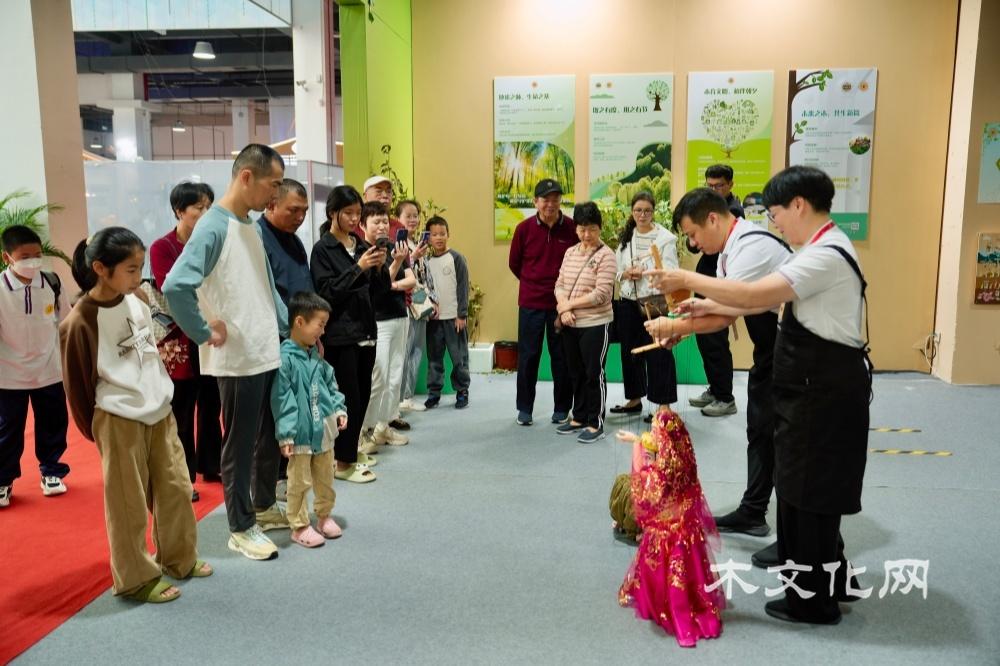 第二部分:与木为伴,方得清欢。互动体验成为这部分的亮点。国家级非遗“泰顺木偶头雕刻”传承人、温州市工艺美术大师季天渊和林季聃亲临现场展示木偶制作并带来精彩的木偶表演。状元红文化家具有限公司总经理王志达现场指导“木墩和林儿”主题的雕版印刷,感受传统技艺的魅力与乐趣。国际木文化学会特邀两位木艺术家,来自希腊的Georgios Athanasakis与塞浦路斯的Antri Pafiti作为第十六届“艺鼎杯”木雕技艺竞赛的展演嘉宾,他们也带来了精美的木雕作品在木文化体验馆展出。