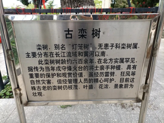古栾树旁有一说明牌:古栾树栾树,别名“灯笼树”,无患子科栾树属,主要分布在长江流域和黄河以南。此栾树树龄约六百余年,在北方实属罕见,据传为当年成守烽火台的将士亲手种植,具有重要的保护和观赏价值。虽经历雷劈、狂风等自然灾害,但经管理人员的精心呵护,目前这株古老的栾树仍枝茂、叶盛、花浓,景象蔚为壮观。
