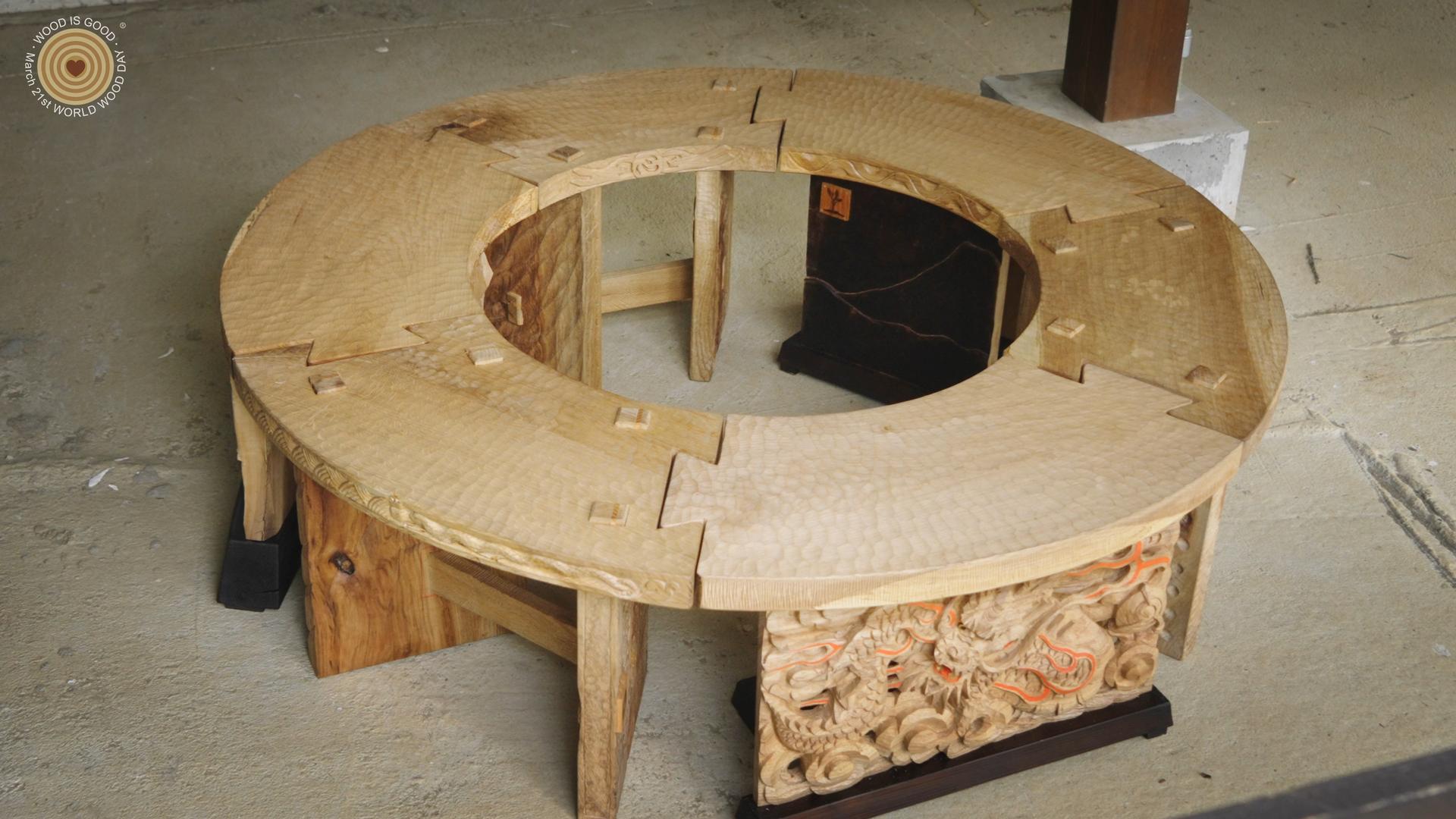 在为期两周(8月21日至9月2日)的活动期间,来自爱尔兰、美国、加拿大、澳大利亚等国和日本当地共计15位木艺匠师及4位助手组成创作团队,围绕“聚合”(Gathering)这一主题,共同创作多部件组合作品。