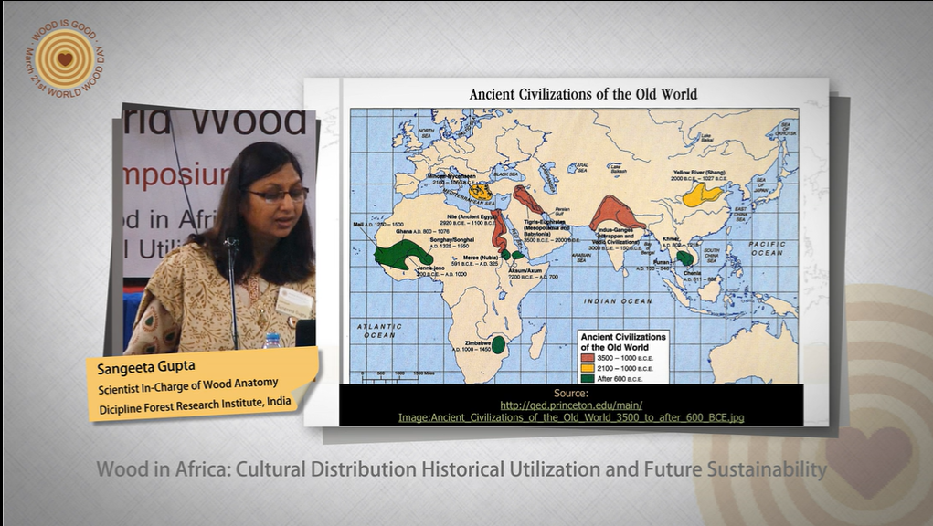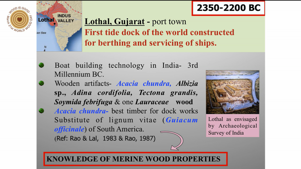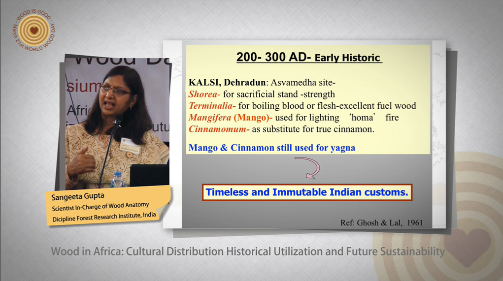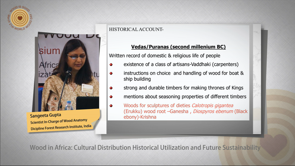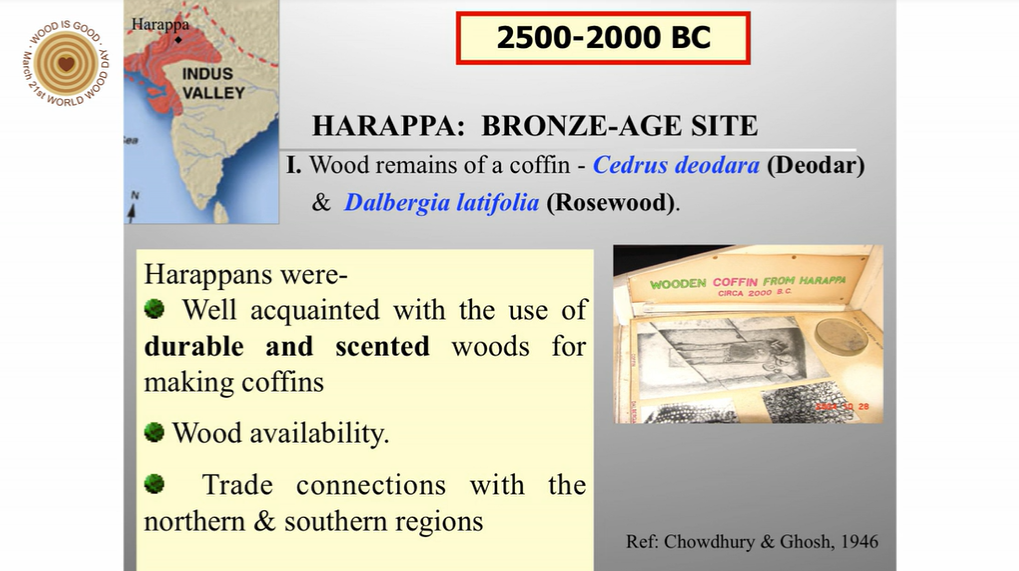 Wood has been part of Indian culture since time immemorial. The oldest record is of a Neolithic site-Burzahom (2375 - 1535 B.C.) from where charred twigs of Parrotia jacquemontiana was reported 1). The twigs of this taxa are used for wicker work even today reflecting upon immortal traditions. The well known Indus Valley Civilization is among the earliest known civilizations of the world and represents Bronze age (2350 - 1750 B.C.). The study of wood remains from Indus Valley Civilization reflects use of scented, ornamental and durable woods like Cedrus deodara and Dalbergia latifolia for coffin. Wooden mortar of Zizyphus sp. for pounding rice and use of Acacia chundra for dock work are of great significance. The species used at most of the Iron age sites were Tectona grandis (Teak), Shorea robusta (Sal), Diospyros sp., Mimusops sp., Terminalia sp., Mangifera sp., Cinnamomum sp. and Heritiera sp. suggesting use of most suitable woods from among the locally available ones. Most of the studies of pre-historic sites suggest a very good knowledge of wood properties prevailing in the ancient India. This is followed by historic period wherein written records of wood species used in temples, shipbuilding, furniture, musical instruments, toys etc. suggest well-developed wood culture in India. Well-known timbers were used in most of the cases like Santalum album, Tectona grandis, Dalbergia sissoo, Dalbergia latifolia, Cedrus deodara, Shorea robusta, Madhuca longifolia, Juglans regia, Diospyros sp., Swietenia sp. etc. Besides these woods, Bamboos and Coconut wood also find several uses in Indian culture.