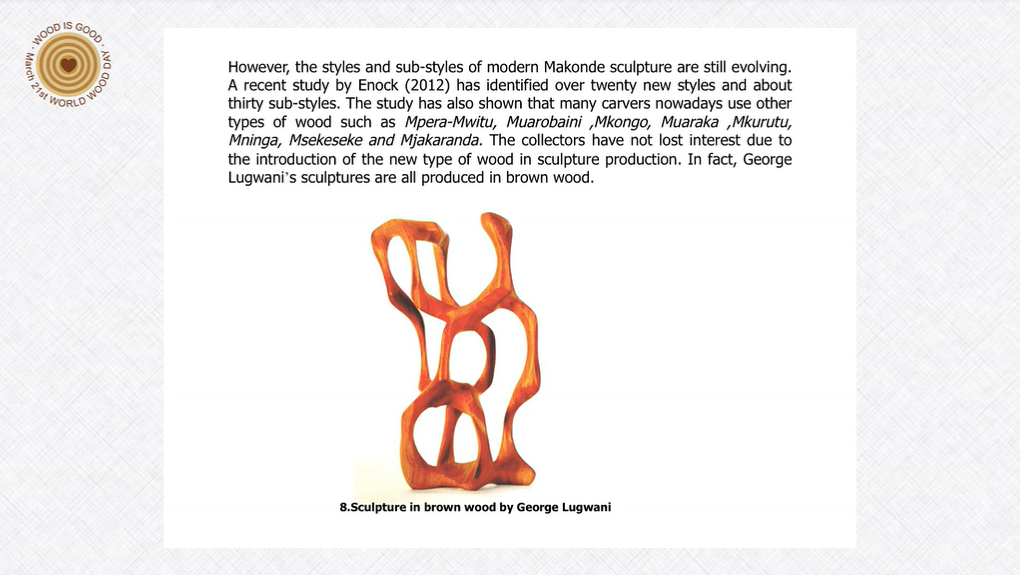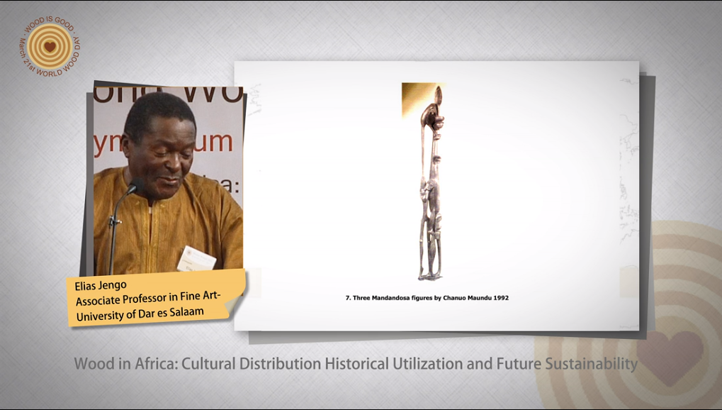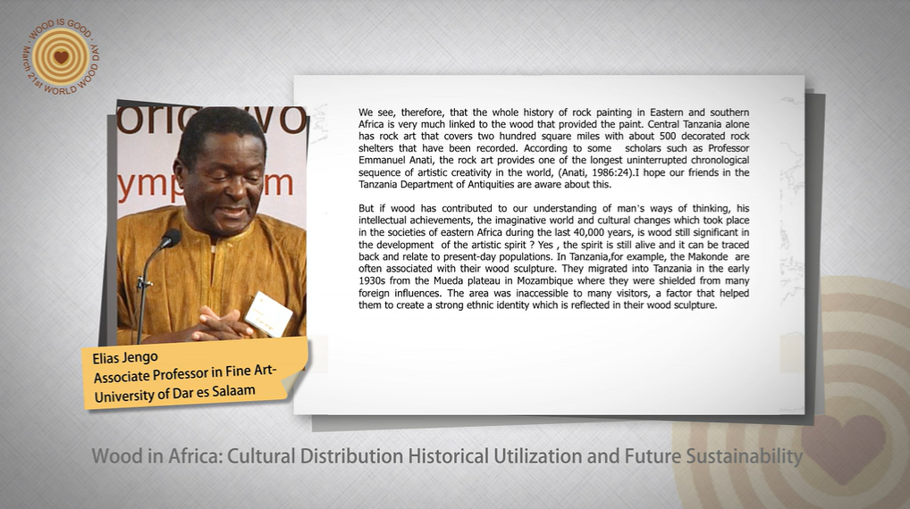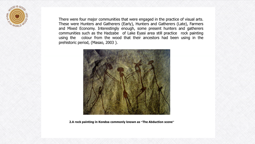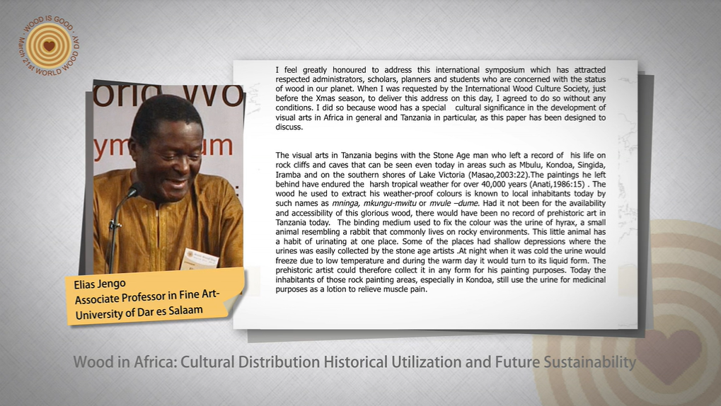 The paper discusses the cultural contribution of wood from the prehistoric times to the present.The prehistoric rock art of Tanzania is shown as evidence of the earliest form of art that used a wood resin as the binding medium for the colours the prehistoric artist used. Without the use of this resin there would have been no prehistoric painting and drawing.The colours have withstood the harsh weather of the tropics for over 40,000 years. This has gone down in history as one of the greatest cultural contributions ever made by wood in East Africa in general and Tanzania in particular. The paper also takes into account modern Makonde sculpture as one of the greatest contributions made by the African blackwood (Dalbergia melanoxylon). Tanzania has been home of this contemporary sculpture initiated by the migrant Mozambican Makonde since the early 1930s. Had it not been for the accessibility and availability of this kind of wood, there would have been no Makonde sculpture in the world today.