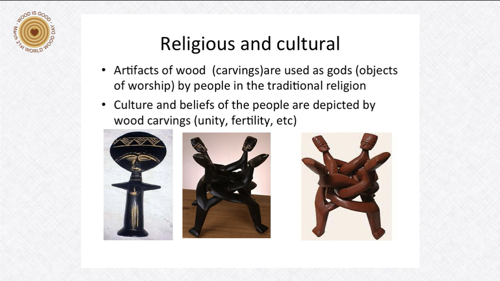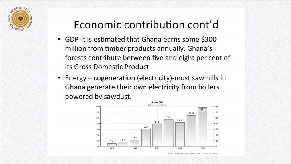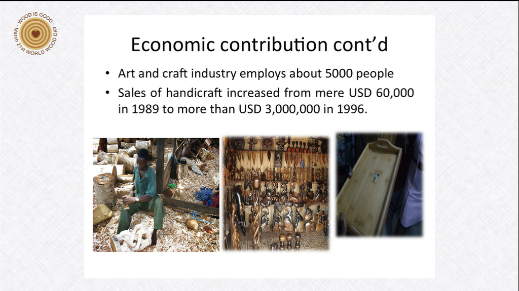 Wood is a sustainable raw material and many depend on it for their livelihood. In Ghana, wood and wood products contribute immensely to the gross domestic products of the nation. The social, religious, cultural and economic importance of wood to the development of rural communities and the nation at large is immense. This paper reviews the contributions wood and wood processing and craft industries have made in various aspects of life towards the development of rural communities in Ghana. Literature was reviewed for information and primary data were collected through interviews and questionnaires. It was reported that in 2011 over 107 Million Euros was realized from the export of wood products. The wood industry provides direct employment to several thousand people, and partial employment and livelihood for an estimated two million people. Apart from providing jobs and income locally, the industry also undertakes rural development projects such as road construction, building of schools and provision of health facilities. Sale of handicraft (mostly wood carvings) increased from mere USD 60,000 in 1989 to more than USD 3,000,000 in 1996 and current trend indicate an increase in the sales of wood carvings in many of the carving centres. In Ghana, it is estimated that about 20-30,000 people are engaged in the wood craft business with some individual ventures making up to about USD 62,500. It is recommended that wood carvers associations in the country should be supported to acquire modern tools and equipment to enhance their output and contribute to livelihood and development of the country.