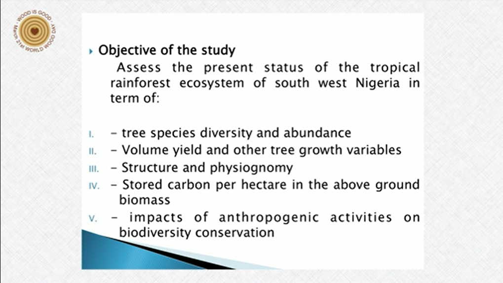The tropical rainforest ecosystem of many Southwest and Southeast Nigeria is one of the major vegetations in Nigeria. Even though It is just about 2% of the total forest area of Nigeria, it has been adjudged the most diverse, most depended upon for indispensable ecosystem services. It is the major source of timber and non-timber products. It is highly extracted for round wood. This study was carried out to examine the present status of the tropical rainforest ecosystem of southwest Nigeria in terms of wood species diversity, abundance and yield. The various functions of these wood species to both rural and urban communities were also examined. Data were collected from 11 selected forest reserves in four states of south western Nigeria. Sample plots of 25m X 25m in size were laid in alternate direction along each transect at 250m interval, summing up to 4 sample plots per 1000m transect. In each plot all living trees with dbh > 10 cm were identified and growth parameters were measured. All computed values were extrapolated for a hectare. Biodiversity indices and analytical formula were used to analyze the data. The results indicated that the rainforest ecosystem is very rich in wood species which are of high economic, ecological and traditional importance to rural and national development. There was a total of 3,666 stem/ha, 188 species and 44 families in the forests. These species were the main sources of herbs for medicinal purposes, food, fruit, spices and several NTFPs. The Family Sterculiaceae has the highest number of stems/ha and species (677 stem/ha and 15 species), followed by Ebenaceae with 414 stem/ha while 10 of the families had only one stem/ha each. Only Moraceae family occurred in all the locations. The highest relative dominance (24.59%) and FIV (49.57) were recorded for Sterculiaceae family, followed by Leguminosae (Caesalpinioideae) with 11.50% relative dominance and 25.66 FIV. The results of the Shannon-Weiner diversity index and Evenness were 4.17 and 0.80 respectively. For the yield of the ecosystem, the mean basal area and volume per hectare were 31.79m2 and 369.76m3 respectively, the mean dbh was 27.82cm and the mean height was 15.15m. Highest proportion of the trees was in the small diameter class as expected of maturing natural forest. The high wood species diversity and yield of this ecosystem made it to be of immense importance and as a result, under intense pressure and exploitation. Models for the sustainable management of the ecosystem were recommended.