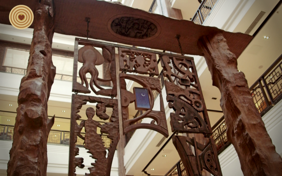在交换创作中,为节约时间,国际组成员沿用热身创作中的成功模式,艺术家们各自雕刻一块作品,而后拼成传统艺术之门的门板,作品与框架及作品与作品之间采用金属纽扣链接,使之能自由摆动,又寓之“动感之门”。