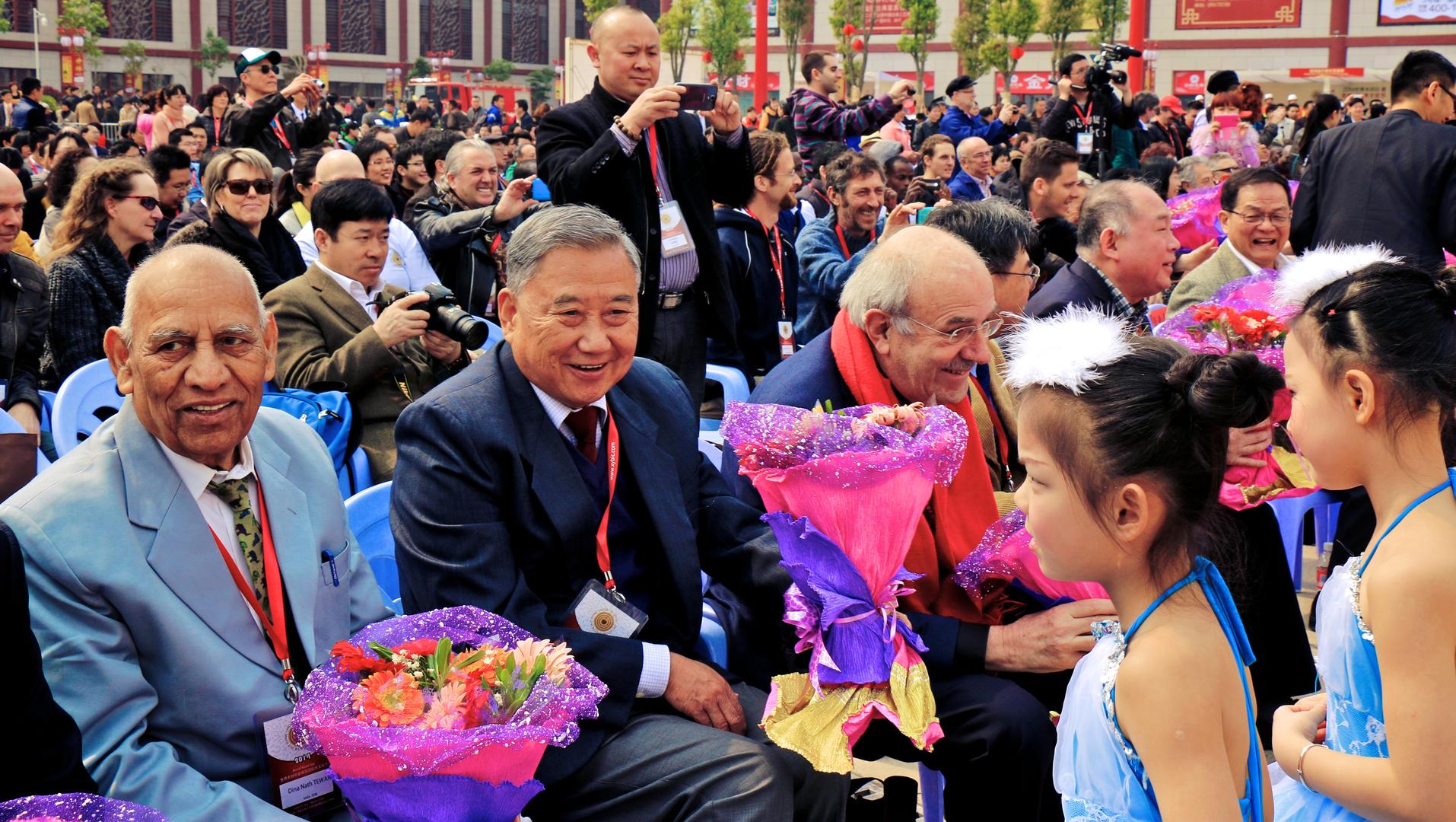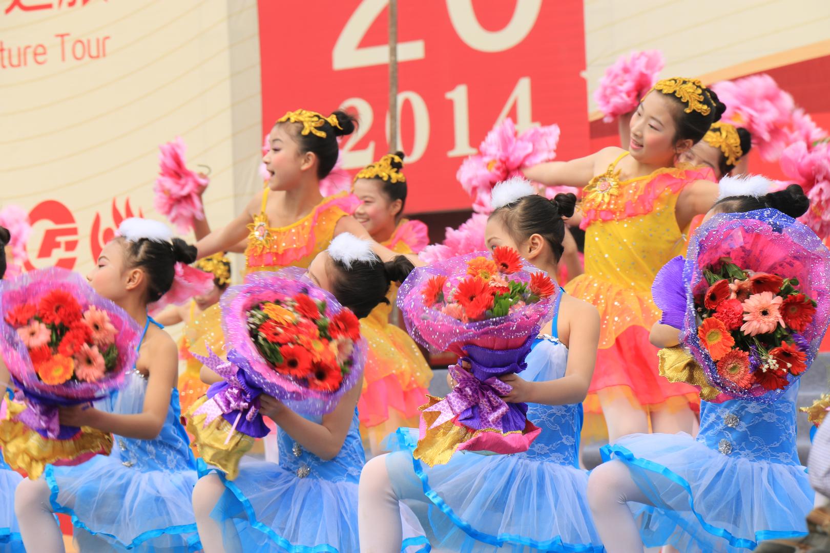 当地的孩子们在开幕式的舞蹈节目上手捧鲜花,欢迎所有参与盛会的嘉宾