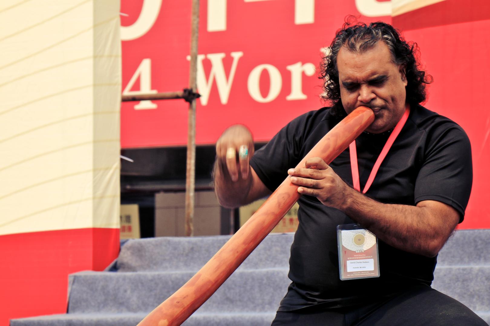 澳大利亚音乐家David Hudson表演了迪吉里杜(didgeridoo),这是一种来自澳大利亚原住民的木制乐器