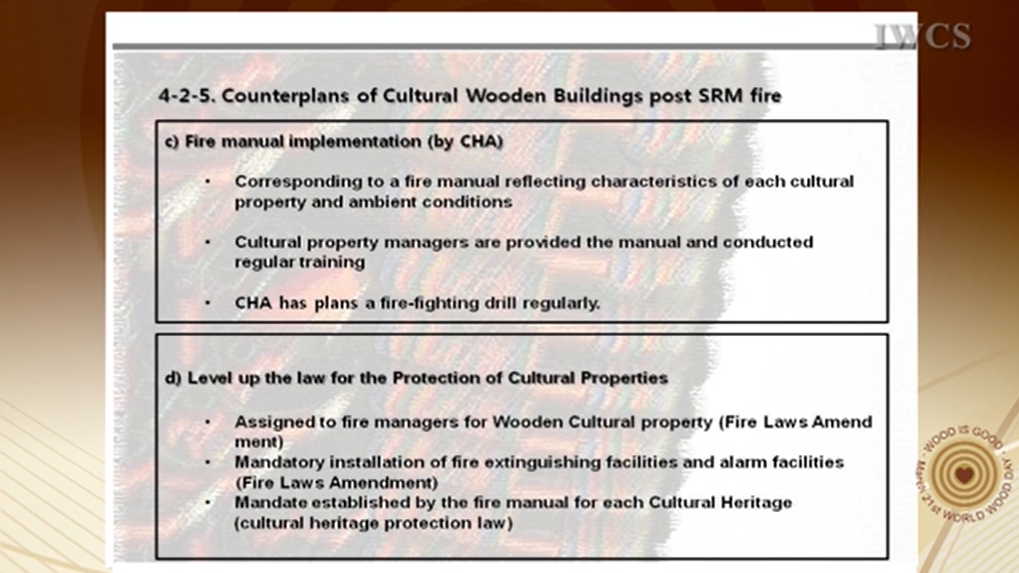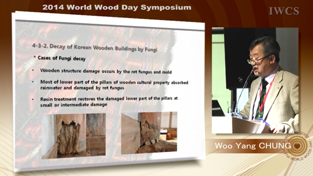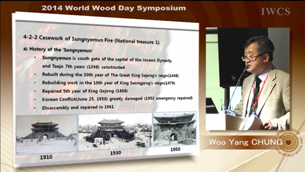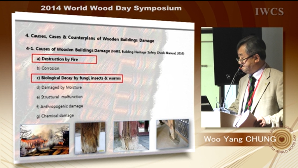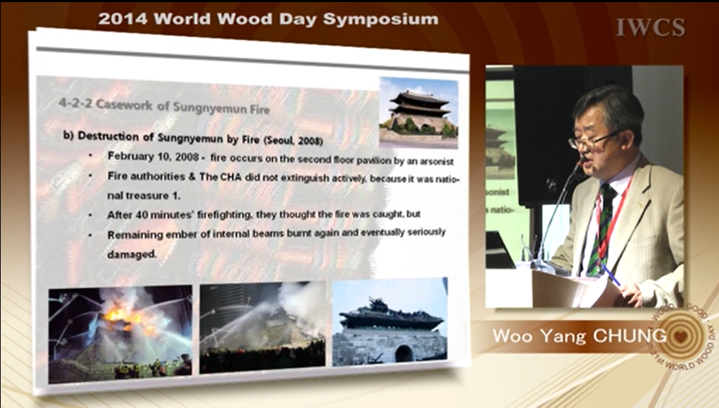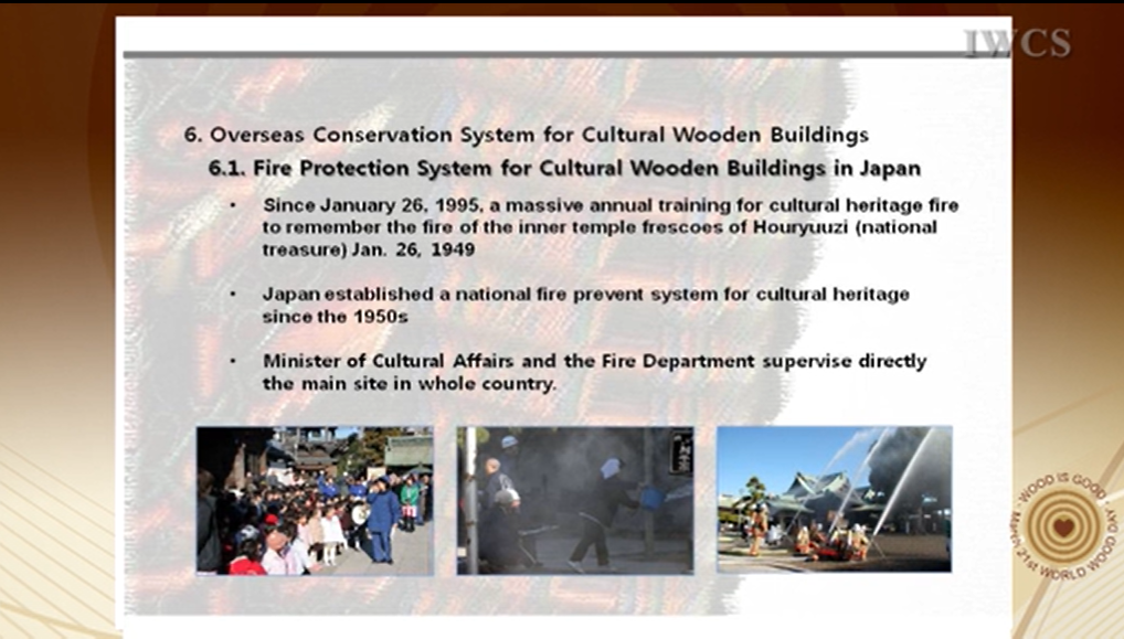 Being exposed to natural environment, wooden building heritage must be controlled conservatively against various deterioration factors. There are 168 traditional wooden buildings named the national registered cultural heritages, the 8% of whole registered heritages in Korea. These are liable to biological deterioration and anthropogenic damages. Under nowadays global warming situation, termites, cigarette beetles, moths and fungi attack many cultural wooden buildings. Disastrous fire destruction of main wooden building heritages also occur incessantly. Preventive system against fire destruction of building heritage was drastically transfigured after the destruction of ‘Naksansa’ (Buddhist temple) by forest fire in 2005 and ‘Sungnyemun’(National Treasure #1) by an arsonist in 2008. The Korea Forest Service, the Cultural Heritage Administration and the National Emergency Management Agency collaborated to include the cultural heritage in the forest fire prevention system and to make the corresponding manual for cultural heritage fire. They have established the mutual cooperative system via annual safety checking to prevent fire of cultural wooden buildings.