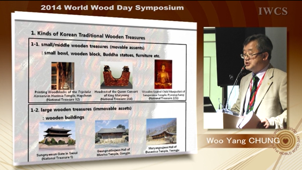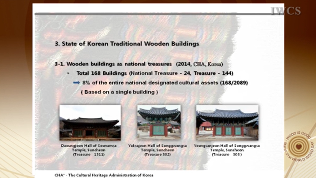 Korean wooden cultural heritage can be divided into the movable assets as wood printing block, wooden statue of Buddha and wooden furniture, and the immovable assets as religious and residential wooden buildings of which characteristics are the availability of raw materials i.e., wood, stones, and ocher and the structure skeleton construction with every members.