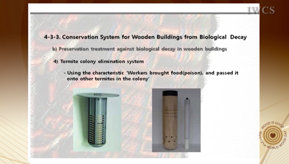 The Cultural Heritage Administration has plan to inspect for the biological damage of total building heritage from 2011 to 2015. It adopts termite detecting dogs, the endoscopy, ultra short and microwave detectors and executes the post treatment of fumigation, preservatives and soil treatments and termite colony elimination.