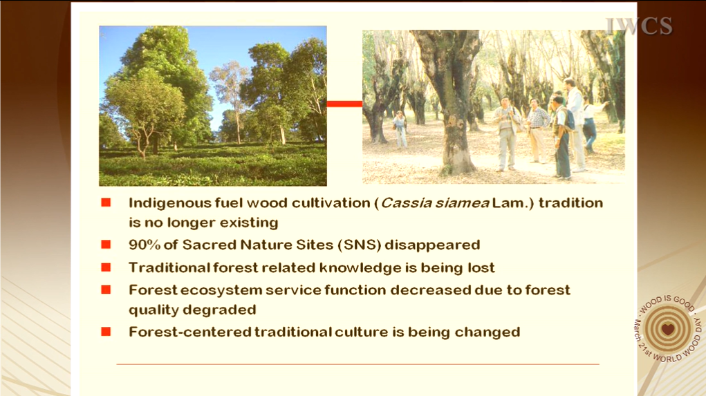 Over the last half century, a remarkable change was happened in socio-economy-environment of Xishuangbanna. A great progress has been made in political system, people life and living standards as well as public facilities. At the same time forest land was largely converted into rubber plantation, biodiversity is declining and environment is degraded. The changing Xishuangbanna today is seen as a good example of China’s modern development and globalization linkages. The impact of modern development on traditional forest culture is suggested to be a strong support to analysis the impact on traditional forest culture both positively and negatively. This paper discusses: Positive impact covering large reducing timber and fuel wood harvesting from forest; stopping shifting agriculture in mountain forest area; prohibition of hunting, and livelihoods of rural people much improved. Negative impact including large forest land converted into rubber plantation; forest degradation, biodiversity lost, and disappearing of traditional knowledge on forest management and conservation that will be leading to s significant change of people’s cultural values on forest including wood culture and sustainable development in the region.