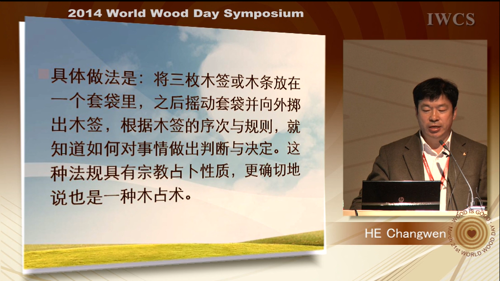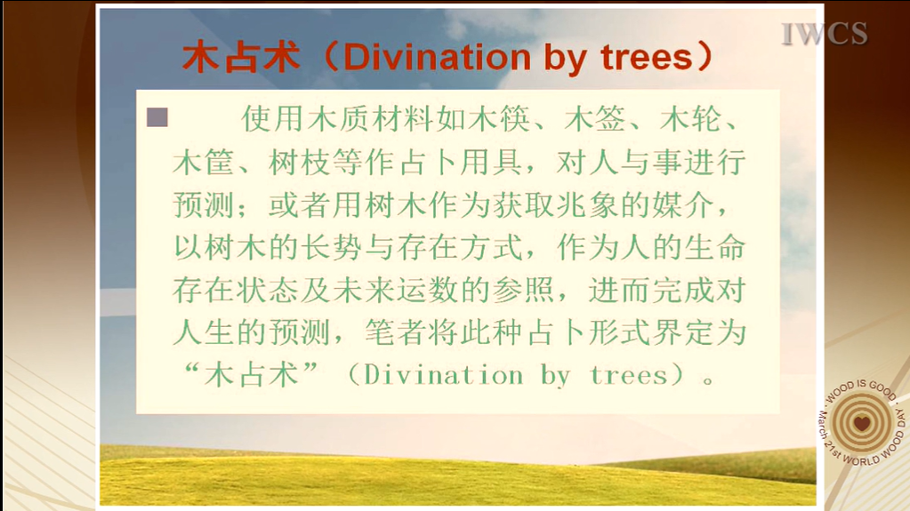 Divination, the previous cultural form of religion, which prevailed in the whole Chinese Bronze age, had great impacts on social life. There were various forms of divination in ancient China, and interpretation by astrology, dreams, turtle shell and milfoil were the general forms. However, there was another form of divination barely known, that is divination by wood, or instance, wooden chopsticks, signature, wheel basket or branches. Wood was taken as a medium of obtaining omens, and its growth pattern was referred to life status and fortune. This form of divination has been defined as divination by wood, which is more significant to the original culture, comparing to other forms. The rich belief of wood reflects religious-philosophical notions.