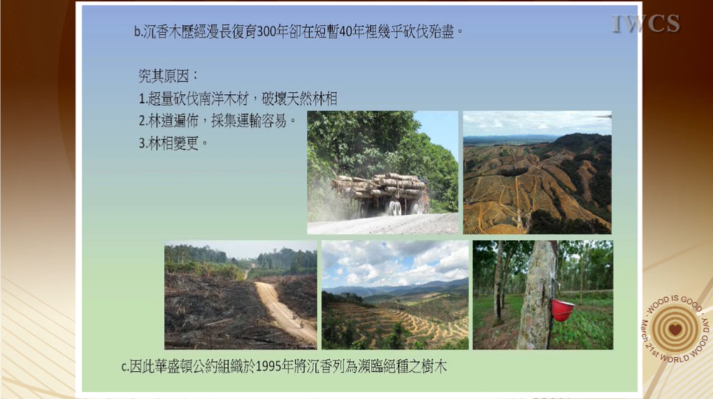 Between the1300s-1700s, agarwood was circulated to the West via the Silk Road. The areas of the Middle East served as a distribution centre and therefore nurtured a glorious "culture of Persian incense." Starting from Marco Polo's exploration of trading course of the voyage, distributed in the ports of Fujian province and Da Nang of Vietnam, a great number of agarwood was exported to the Western countries. However, the over flow of agarwood into the West had almost wiped out the productions that were originated from India, Nepal, Bengal, Yunnan province, Guangdong and Guangxi provinces, Malaysia, Indonesia, and Indochina. Of those places of origins, after experiencing the ecological restoration for 250 years, Indonesia restarted the exportation fifty years ago. Whereas the countries in the Middle East and Taiwan had become prosperous in economy, the demand of agarwood had extremely increased during 1970-1995. The trees, again, were deforested shortly in forty years. Due to the changing appearance of forests and convenient transportation to forest land, the Convention on International Trade in Endangered Species of Wild Flora and Fauna listed agarwood under the category of critically endangered wood in 1995.