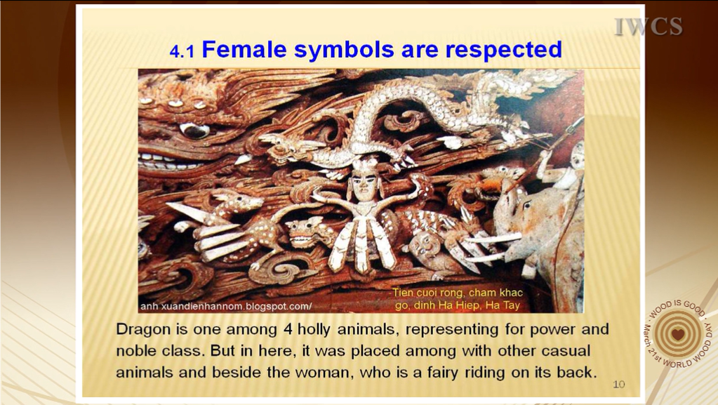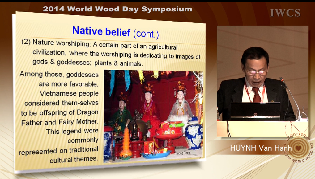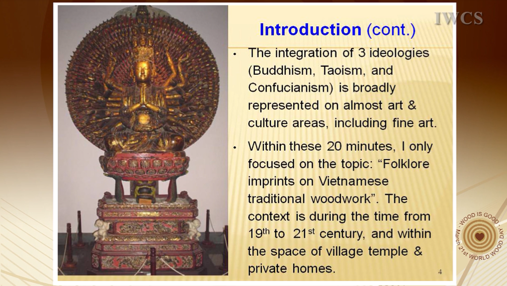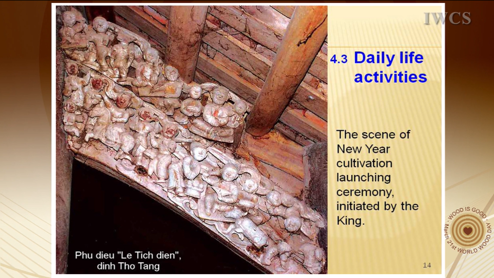 On the base of 3 Traditional Culture Pillars of Vietnam, which are nature worshipping, god & saint worshipping, and ancestor worshipping, this presentation is to focus on making clear the imprints of these traditional cultural characteristics on the wood works during the time from 16th to 19th centuries, and at the same time to introduce lively various aspects of Vietnamese social living.